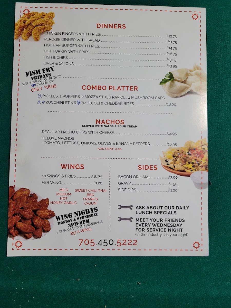 In addition to food, the menu includes a range of drink options common to bar establishments. These likely encompass beer, mixed drinks, and custom drinks, with accommodations available for specialized requests such as no/low sugar and non-carbonated beverages.